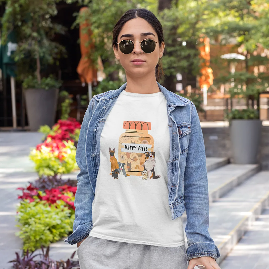 - Majice za vlasnike pasa s „Happy Pills“ dizajnom tiskane su na Malfini odjeći češkog proizvođača koji je posvećen proizvodnji kvalitetne ekološke odjeće s poštovanjem prema prirodi i ljudima koji ih izrađuju