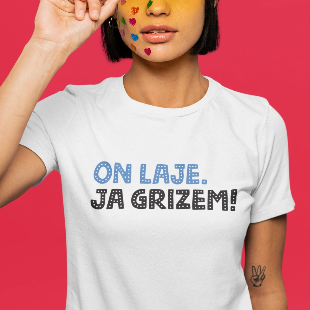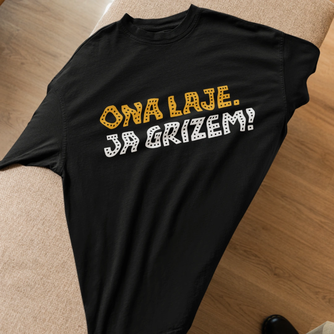 - „Ona laje, ja grizem“ i “On laje, ja grizem” dizajni tiskani su na Stanley/Stella majicama belgijskog proizvođača koji je posvećen proizvodnji kvalitetne ekološke odjeće s poštovanjem prema ljudima koji ih izrađuju i prirodi